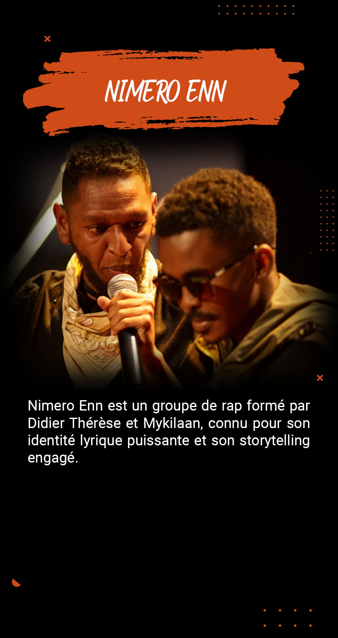 Ce duo de rap légendaire de Curepipe, connu sous le nom de Nimero Enn, connu tout d’abord sous le nom de collectif A4c, porte une philosophie qui change tout dans le monde du rap : « Je suis numéro un, nous sommes tous numéro un » – un message ancré dans la conviction que nous sommes tous numéro un et qu’il nous appartient de devenir la meilleure version de nous-mêmes.