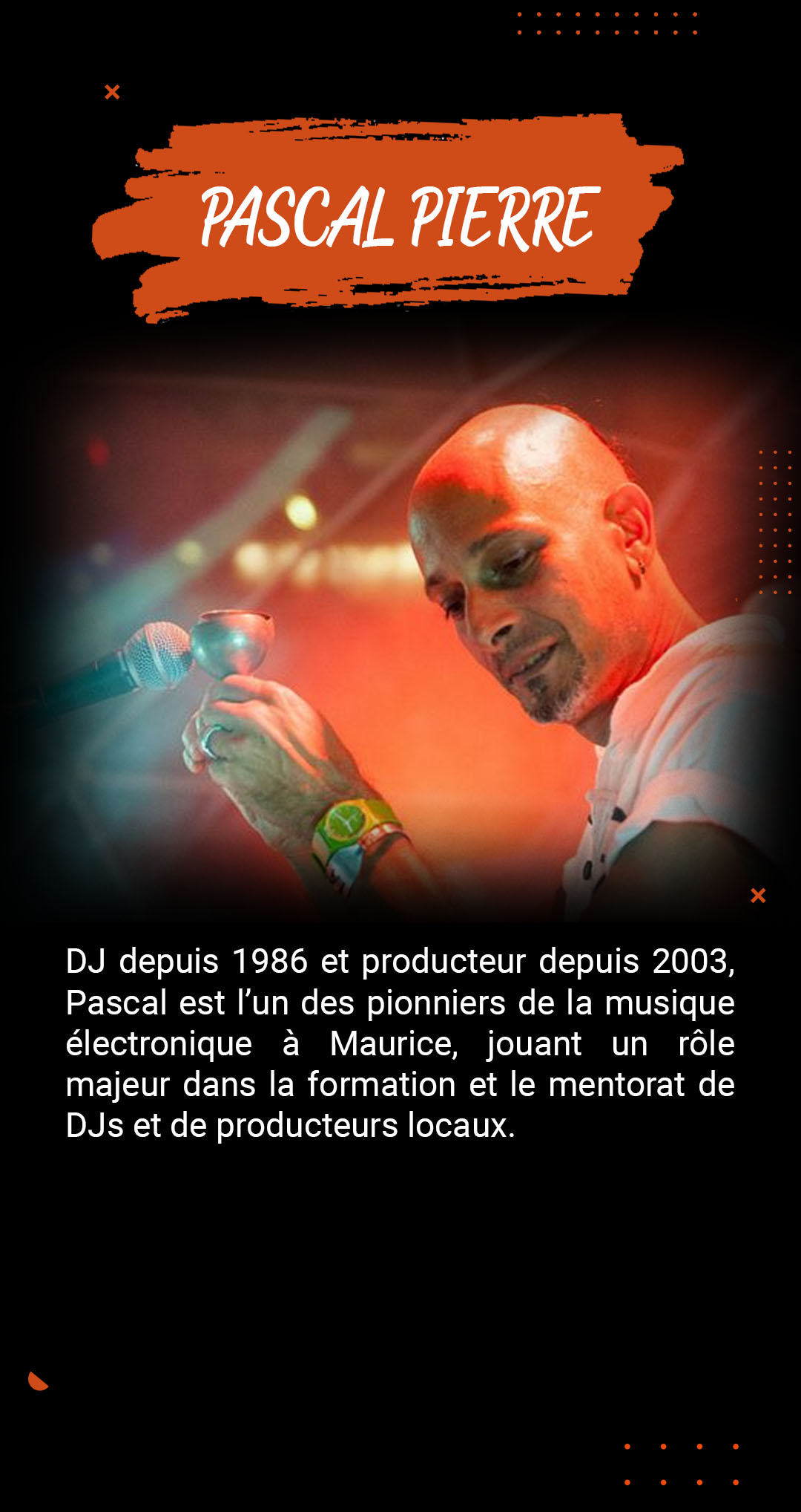 Pascal Pierre (GURU) est l’un des pionniers de la musique électronique à Maurice, avec une carrière musicale de plus de 40 ans. Il débute comme DJ en 1986 et devient DJ résident en 1988 au Sam’s Disco, l’un des clubs les plus emblématiques de l’océan Indien à l’époque.
