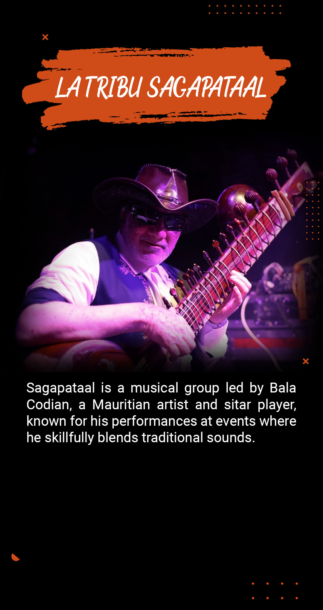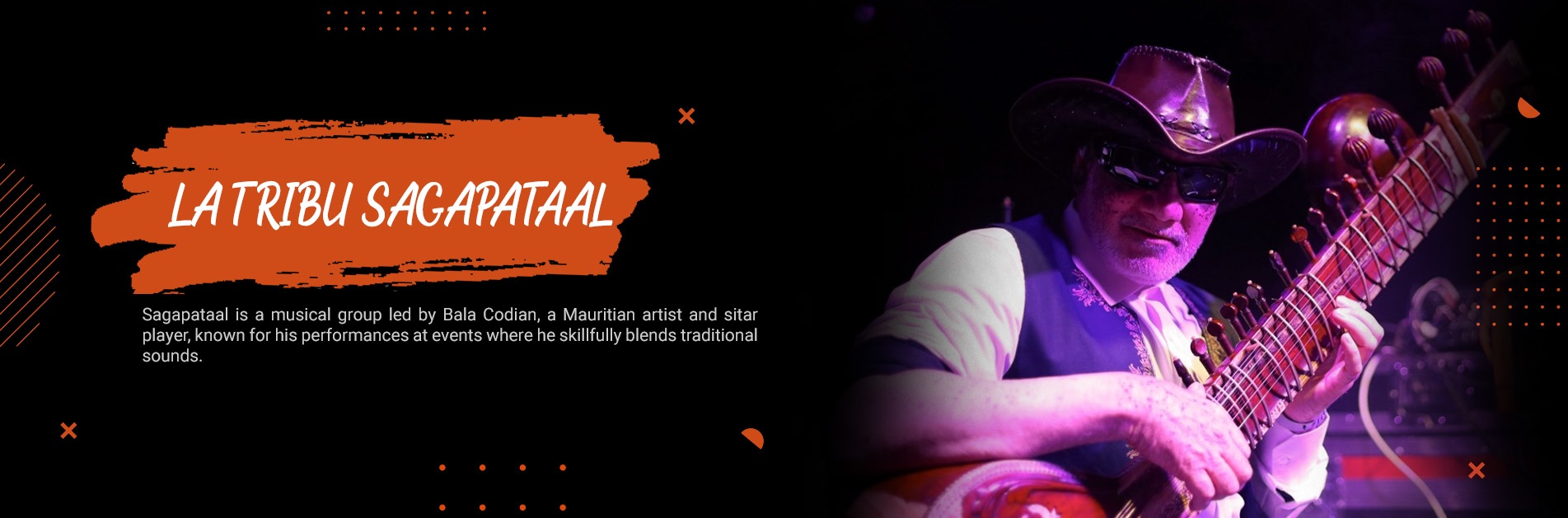 Since 2003, Sagapataal has collaborated with Pascal Pierre, performing together under the name of Guru et la tribu, blending live instruments with electronic music and DJ culture, creating a unique bridge between traditional and modern sound. Their musical journey has continuously evolved, with performances across Mauritius and internationally, from major hotels, events and festivals to diverse cultural stages.
