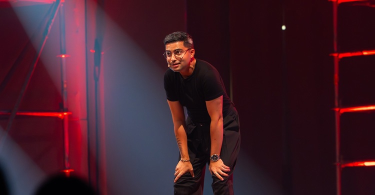 Avec Moi Moi Moi, l’humoriste franchit un nouveau cap. La mise en scène touche un niveau de sophistication digne des spectacles internationaux : entrée immersive, jeux de lumière sophistiqués, danseurs sur scène… tout est orchestré pour offrir une véritable expérience sensorielle. Et puis, le rire s’installe, immédiat et irrésistible. « Mo micro ti teigne », lance-t-il, faussement nonchalant. La salle explose. La mécanique est enclenchée — elle ne relâchera jamais sa puissance pendant près de deux heures.